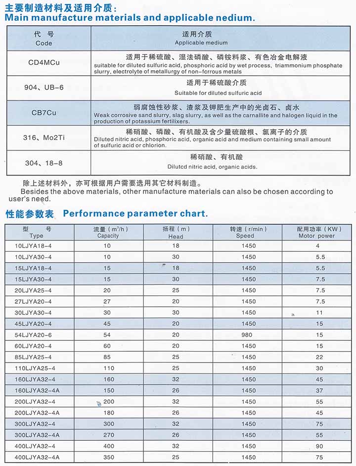 LJYA系列料漿泵為單級單吸立式懸臂式離心液下泵。葉輪為半開式,葉輪前后均配有耐磨蓋,廣泛應用于化工流程輸送含30%以下固體顆粒,粘度低于200CP的磨、腐蝕交互作用的介質(zhì)。特別適用于磷肥工業(yè)中輸送磷酸、磷銨料漿等介質(zhì)。