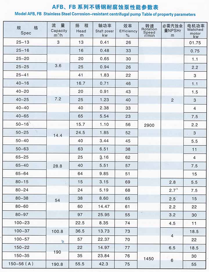 概述: AFB、FB型泵是單級、單級懸臂式耐腐蝕離心泵,該泵過流部位零件根據(jù)輸送介質(zhì)不同,全部選用各種耐腐耐磨合金鋼材料制造,泵的進口壓力-般不大于0.2MPa,必要時可達到0.35~0.4MPa,介質(zhì)溫度-20℃~+130℃,廣泛應(yīng)用于石油、化工、冶金、合成纖維、醫(yī)藥、食品等工業(yè)部門。