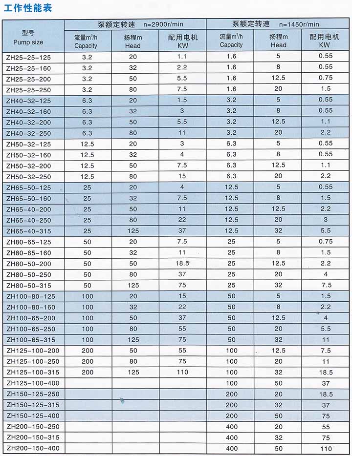 概述: ZH型耐溫耐腐自吸式化工離心泵是我公司結(jié)合國內(nèi)外同類產(chǎn)品研制生產(chǎn)的-種單級(jí)單吸自吸式化工離心泵,該泵適用于輸送溫度0℃~150℃,含固體顆粒小于3毫米腐蝕性介質(zhì)。 如輸送介質(zhì)含有3毫米以上顆?;蚶w維,可選用我公司生產(chǎn)的ZW系列無堵塞自吸泵。 泵的性能范圍:流量為1.6~400m3/h、揚(yáng)程為5~125m。上吸高度為5米以內(nèi)。 根據(jù)所輸送介質(zhì)的不同,ZH型自吸式化工離心泵接觸液體部分的材料可選用鑄鐵、鑄鋼、1Cr18Ni9Ti、1Cr18Ni12M02Ti、316、316L等材料制造。 泵型號(hào)意義說明 Z——自吸式泵代號(hào)the item of spontaneous imbibition pump H——化工離心泵代號(hào)the item of chemical industrycentrifugal pump 50--泵吸入口直徑(mm)the sunction inlet diameter 32--泵出液口直徑(mm)the sunction outlet diameter 160--泵葉輪名義直徑(mm)the nominal impeller diameter A--切割葉輪直徑順序,以A、B、C表示The diameter order of incising impeller,show as A,B,C
