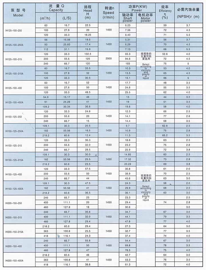 IH型系列泵有40個(gè)基本型,其中33個(gè)雙速(2900、1450r/min)經(jīng)過(guò)A、B兩種型式的葉輪直徑切割變型后,達(dá)112個(gè)規(guī)格。
